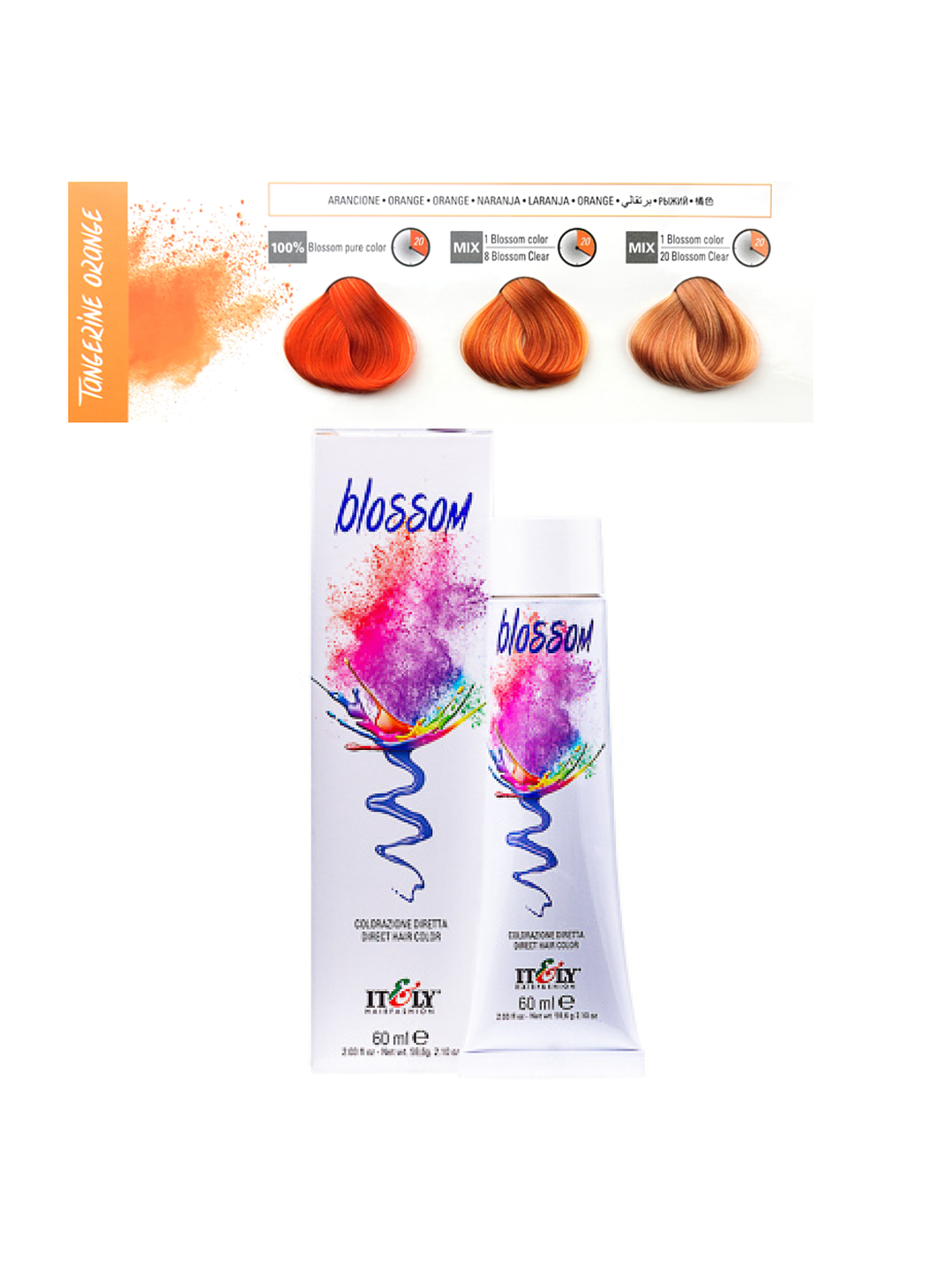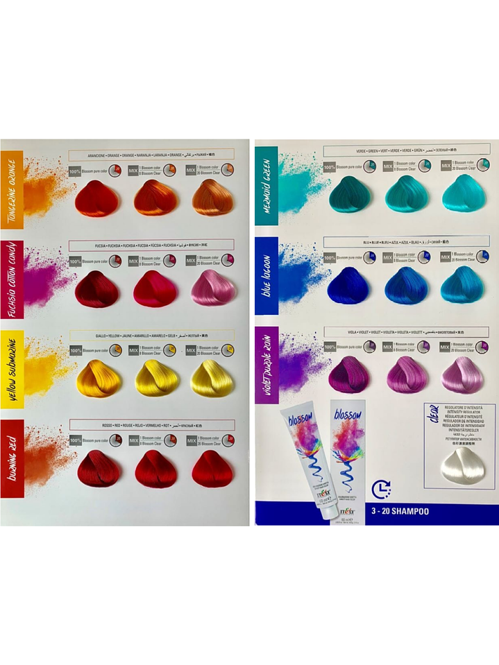 Blossom es un color semipermanente, la intensidad del color puede ser extremadamente vibrante o suave dependiendo del tono aplicado, la base inicial y la porosidad del cabello es extremadamente brillante y suave. El color se desvanece gradualmente con los lavados.