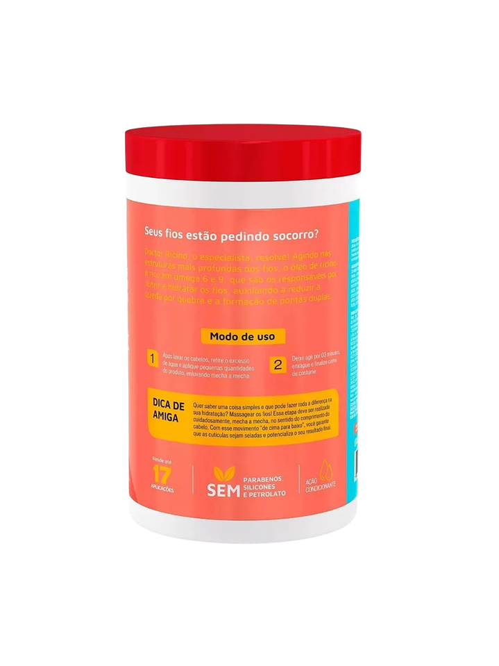La familia Doctor Rícino está impregnado del más puro Aceite de Ricino extraído. Es rico en Omega 6,9, Ácidos Grasos y Vitamina E. Nutre e hidrata el cabello, reduce las puntas abiertas y el frizz, lo que promueve un crecimiento fuerte y saludable. Doctor Rícino es un producto vegano, no testeado en animales y tiene una formula libre de Sulfatos, Parabenos, Siliconas y Vaselina.