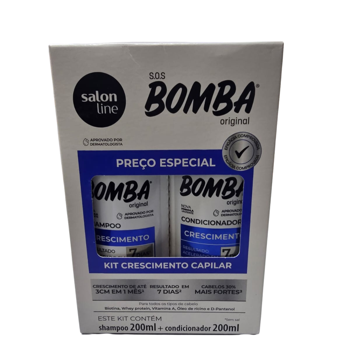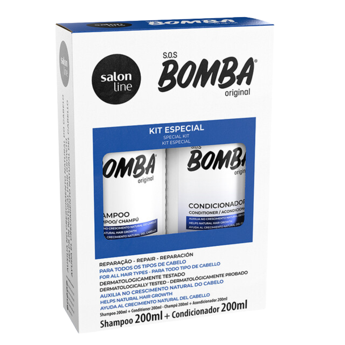 El Kit de Bomba Original con Shampoo y Acondicionador S.O.S tiene una fórmula potente y dermatológicamente probada para combatir la caída del cabello, además de un crecimiento probado y hebras hidratadas y saludables.