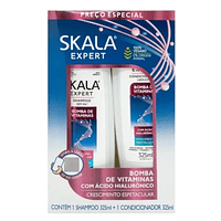 La línea Bomba de Vitaminas Skala Expert posee una fórmula con ingredientes ricos en nutrientes poderosos, que ayudan en el crecimiento del cabello. Contiene Vitamina E ayuda a mantener las hebras sanas, previene la caída. D-pantenol fuerza e hidratación. Aceite de Ricino fortalece y auxilia en la caída por rotura de las hebras. Aceite de Ricino fortalece y auxilia en la caída por rotura de las hebras. Proteínas vegetales (Maíz, Soja y Trigo) dan brillo y suavidad. Para un mejor resultado utilice la línea completa Bomba de Vitaminas Skala.